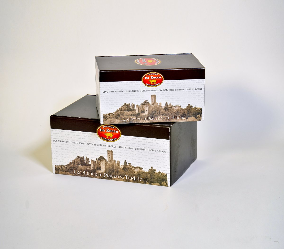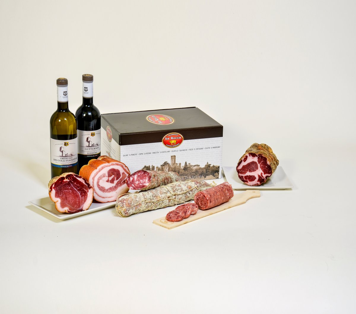 Salame Piacentino DOP 600g Coppa Piacentina DOP trancio 900g Pancetta Piacentina DOP trancio 1,25kg Fiocco di Prosciutto trancio 900g Cotechino precotto 500g Bottiglia di Vino a scelta 0,75lt
